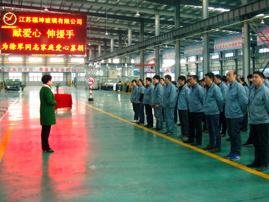 原鋼化車間員工徐琴同志不幸因病去世,公司利用晨會時間組織全體員工為其家庭募集善款5000元。此前在徐琴同志醫(yī) 療間,公司已捐助1.5萬元