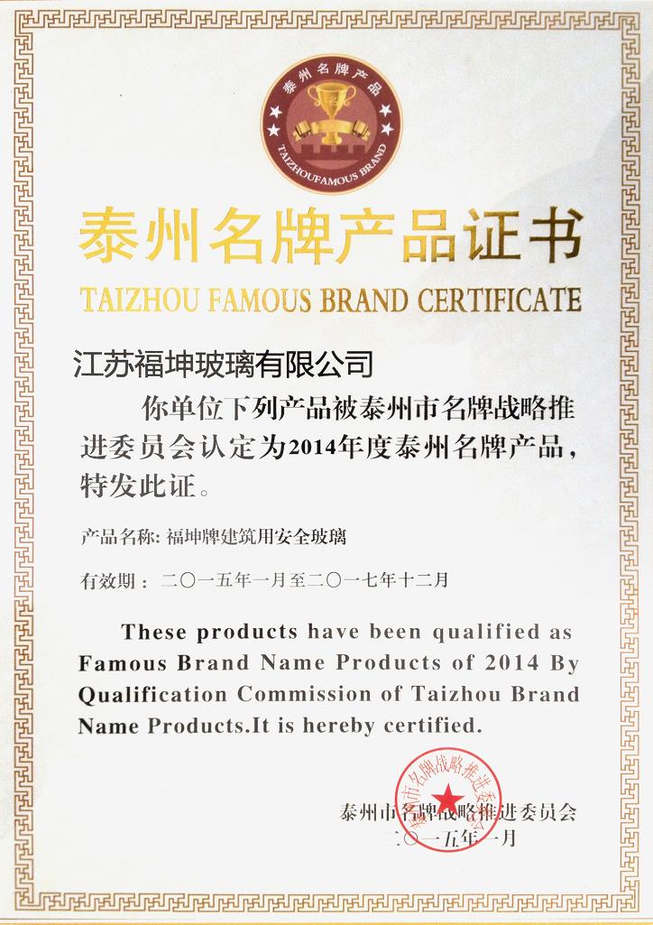 我司產品被泰州市名 牌戰略推進委員會認定為2014年度泰州名 牌產品。